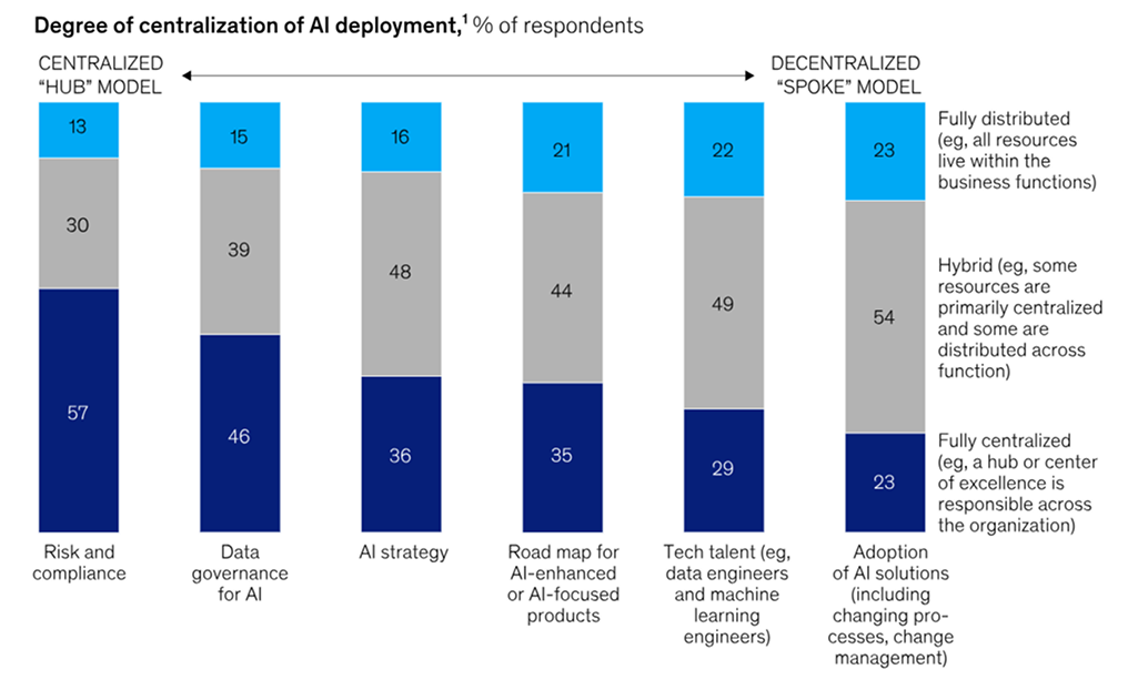 چگونه شرکت ها استقرار هوش مصنوعی نسل خود را سازماندهی می کنند - و چه کسی مسئول است تحلیلهای نظرسنجی ما نشان میدهد که نظارت مدیر عامل بر حاکمیت هوش مصنوعی - یعنی سیاستها، فرآیندها و فناوری لازم برای توسعه و استقرار مسئولانه سیستمهای هوش مصنوعی - یکی از عناصری است که بیشترین ارتباط را با تأثیرات پایینتر گزارش شده توسط خود از استفاده ژنرال هوش مصنوعی یک سازمان دارد.1 این امر بهویژه در شرکتهای بزرگتر صادق است، جایی که مدیر عامل شرکت با بیشترین تأثیر بر AI بر AI بیشتر است. 28 درصد از پاسخدهندگانی که سازمانهایشان از هوش مصنوعی استفاده میکنند گزارش دادهاند که مدیر عامل آنها مسئول نظارت بر حکمرانی هوش مصنوعی است، اگرچه این سهم در سازمانهای بزرگتر با درآمد سالانه 500 میلیون دلار یا بیشتر کمتر است و 17 درصد میگویند حکمرانی هوش مصنوعی توسط هیئت مدیره آنها نظارت میشود. در بسیاری از موارد، حاکمیت هوش مصنوعی به طور مشترک در اختیار است: به طور متوسط، پاسخ دهندگان گزارش می دهند که دو رهبر مسئول هستند. ارزش هوش مصنوعی از سیمکشی مجدد نحوه عملکرد شرکتها ناشی میشود، و آخرین نظرسنجی نشان میدهد که از 25 ویژگی آزمایششده برای سازمانها در هر اندازه، طراحی مجدد گردشهای کاری بیشترین تأثیر را بر توانایی سازمان برای مشاهده تأثیر EBIT از استفاده از هوش مصنوعی نسل دارد. سازمانها با استقرار ژن AI شروع به تغییر شکل جریان کاری خود میکنند. بیست و یک درصد از پاسخدهندگانی که گزارش استفاده از هوش مصنوعی ژنرال توسط سازمانهایشان را گزارش کردهاند، میگویند که سازمانهای آنها حداقل برخی از گردشهای کاری را اساساً دوباره طراحی کردهاند.